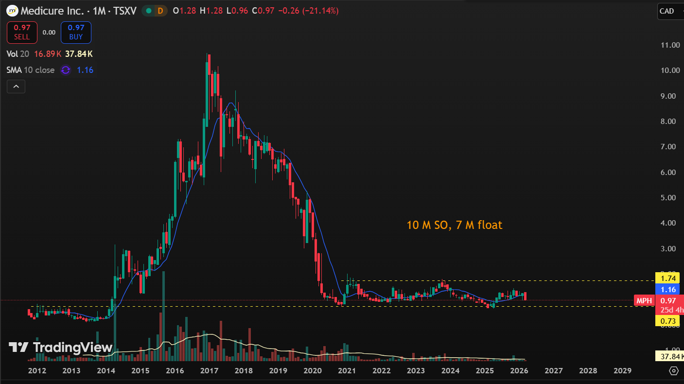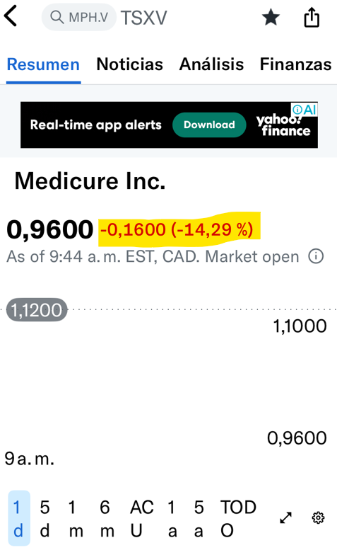 Pero hoy toca hablar de la cara oscura también, porque hay que estar preparado para aguantar cosas por el camino en nombre de la iliquidez, y el ejemplo perfecto fue el movimiento que la canadiense Medicure Inc. (MPH.V) hizo ayer mismo. Mira la imagen de abajo.
